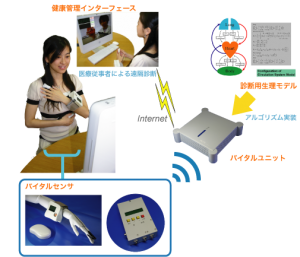 少子高齢社会の中で,家庭内で健康管理を行うことが大変重要となっています。本プロジェクトでは,バイタルセンサにより家庭内で計測された心電,体温,血圧,血液情報といった情報をバイタルユニットを通して医師や医療従事者に送信し,送信された情報をもとに,リアルタイムでの遠隔診断を実現するサイバニックメディケアシステムの開発を行っています。また,診断用生理モデルをバイタルユニットに実装し,バイタルセンサの情報をもとに診断を行うシステムの研究も同時に行っています。このシステムは健康管理だけでなく,本研究室で開発を行っているロボットスーツHALや人工心臓装着者の家庭内における状態管理のためにも重要なシステムと考えられます。